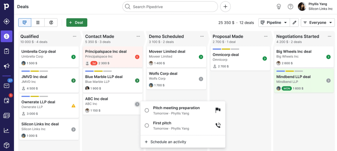 Pipedrive je cloudové řešení pro správu vztahů se zákazníky (CRM), které je navrženo primárně pro prodejní týmy. Je zaměřeno především na prodejní pipeline, což odpovídá jeho názvu. Ačkoli nenabízí žádný bezplatný plán, Pipedrive je cenově dostupný a snadno použitelný, díky čemuž je oblíbenou volbou pro malé podniky.